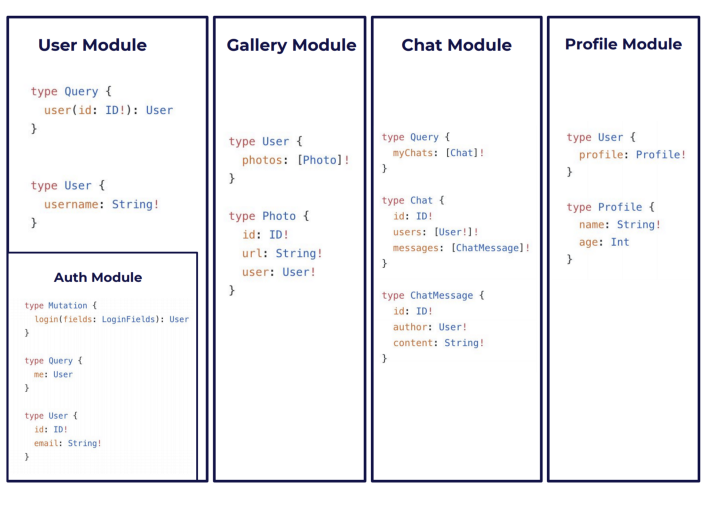 - Schema (types declaration) — each module can define its own Schema, and can extend other schema types (without explicitly providing them).